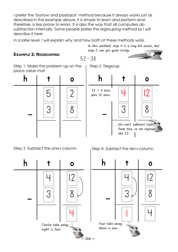The “borrow and payback” (or equal adding) method is the “old way” and the “regrouping” method is the “new way.” It really doesn’t matter which algorithm you (or your child) use, so long as you do it consistently and get the correct answer.