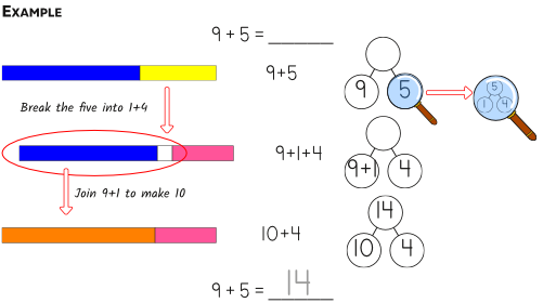While it will serve your child well to memorise these facts, they can get away with using strategy to calculate them as long as the strategy is quick and easy to implement. We need to keep cognitive load low when working on more complex problems. Here are two of our favourite strategies for adding ‘big’ single digit numbers:
